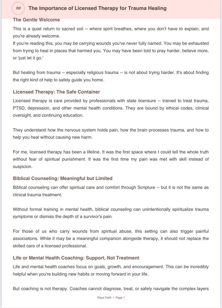 There are moments in healing when we need more than good intentions — we need safe, skilled, and accountable care. This guide is one of my most important offerings to you. It explains the difference between licensed therapy, biblical counseling, and coaching — so you can make choices that protect your healing journey and your heart.
